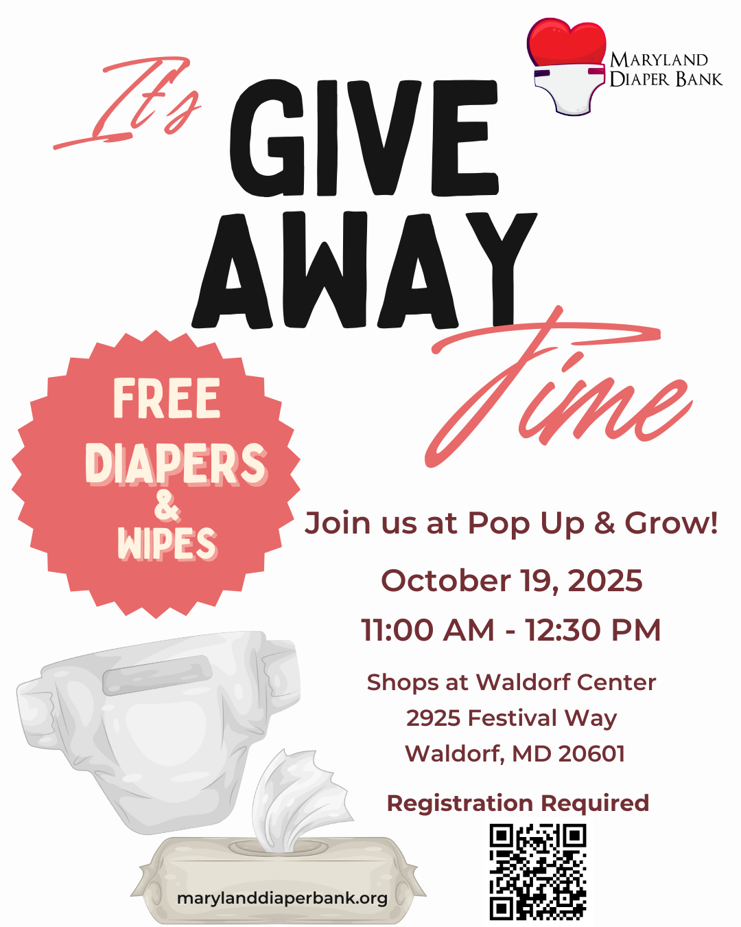 The Maryland Diaper Bank Diaper Distribution will be held on October 19th from 11am - 12:30pm. You must register to ensure the size needed is available. 50 diapers will be provided per baby and 1 pack of baby wipes.